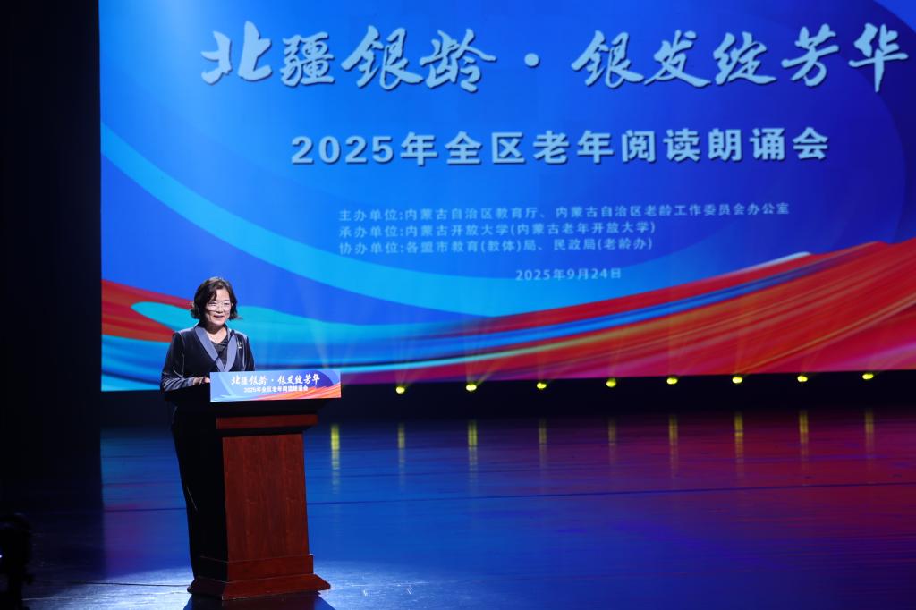 9月24日,由内蒙古自治区教育厅、内蒙古自治区老龄工作委员会办公室联合主办,我校承办的“北疆银龄·银发绽芳华”2025全区老年阅读朗诵会在内蒙古艺术剧院举办。内蒙古自治区教育厅二级巡视员武秀珍,内蒙古自治区民政厅党组成员、副厅长蒙根飒出席开幕式并致辞,开幕式由内蒙古开放大学副书记马桂英主持。