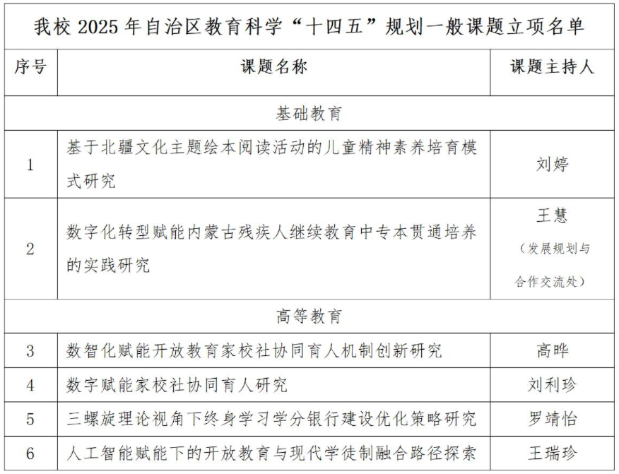 近日,内蒙古自治区教育科学研究与监测评估院公布了2025年度自治区教育科学“十四五”规划一般课题立项评审结果,我校6项课题获批立项。