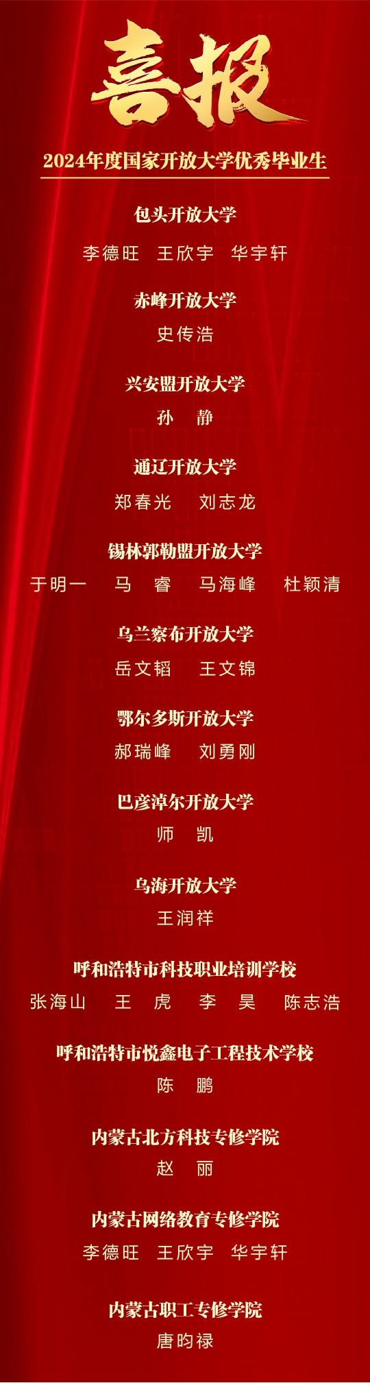 近日,国家开放大学正式印发《关于公布2024年度国家开放大学优秀毕业生名单的通知》(国开学生函〔2025〕8号),我校27名学子荣获“国家开放大学优秀毕业生”荣誉称号。