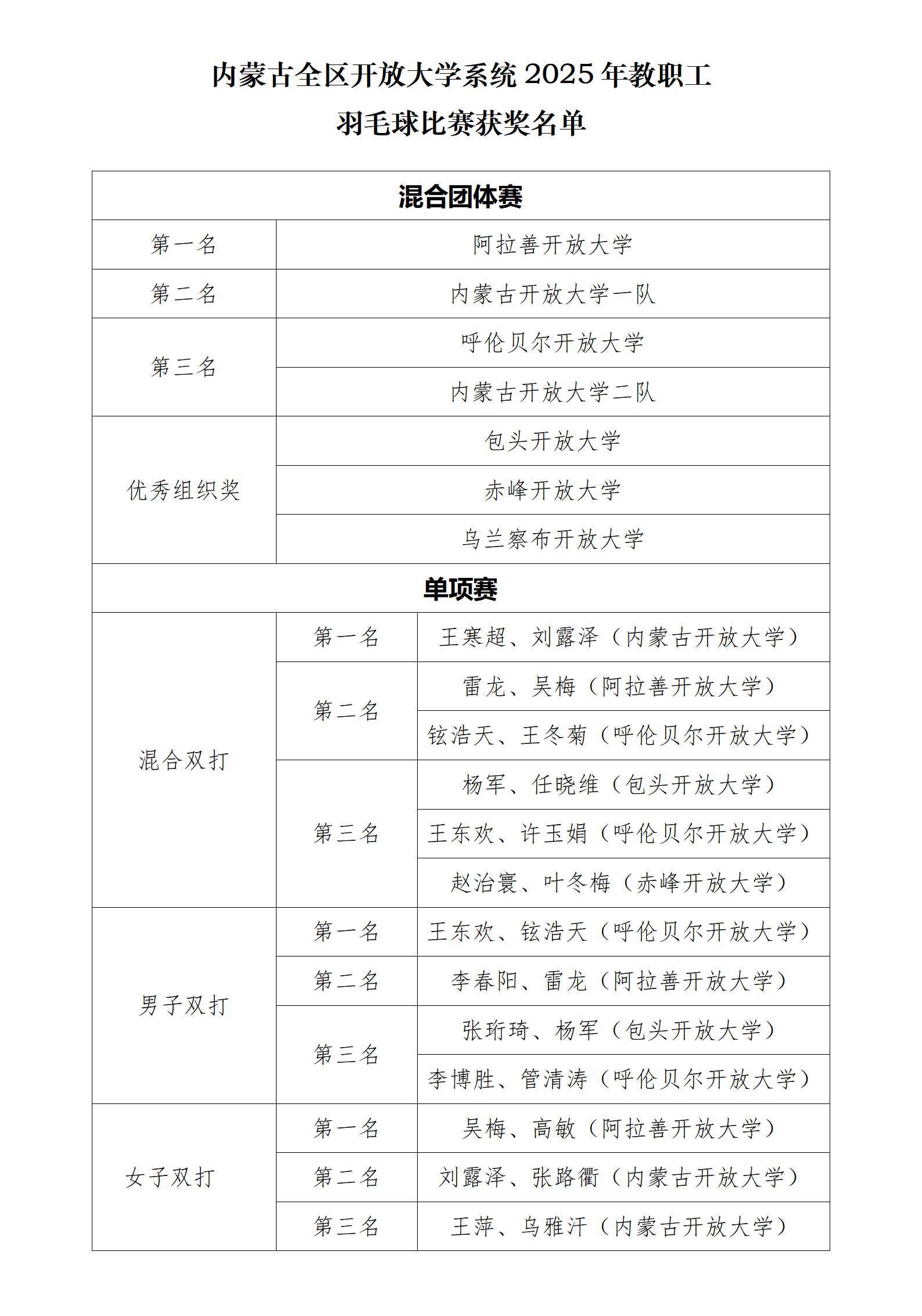 本次羽毛球比赛以竞赛为桥梁,搭建起全区开放大学系统间的交流互动平台,形成了“体育牵引、分校协同、系统联动”的开放大学办学体系新局面。本次羽毛球比赛的成功举办,不仅丰富了广大教职工的文体生活,提升了身体素质与健康水平,增强了团队凝聚力与向心力,同时促进分校之间的情感升华,充分体现了全民健身理念在全区开放大学系统教职工队伍中的深入实践与生动传播,将为推动我校全民健身与全民健康深度融合注入持续动力。