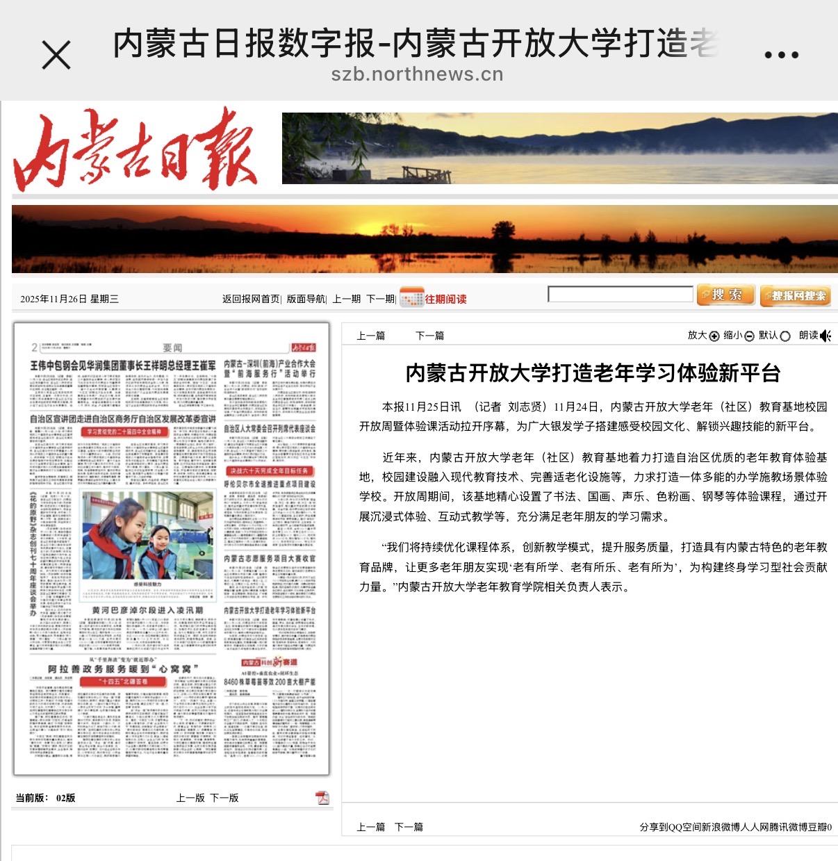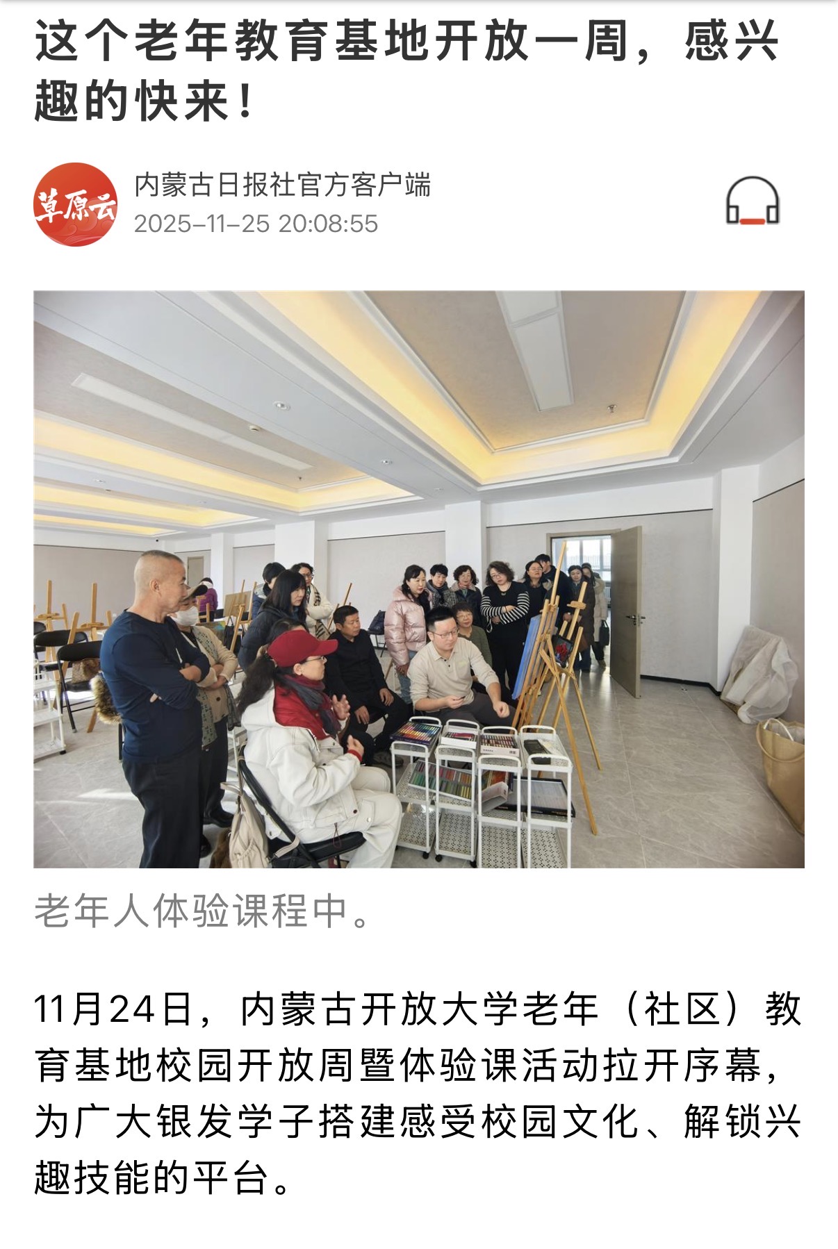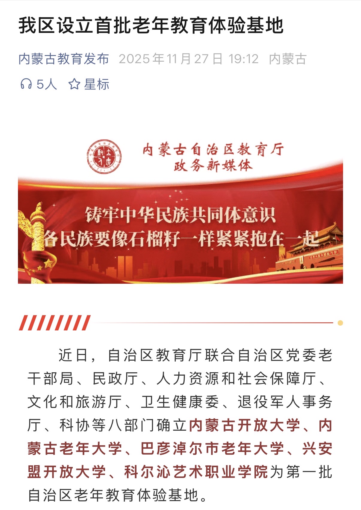 近日,自治区教育厅联合党委老干部局、民政厅、人力资源和社会保障厅、文化和旅游厅、卫生健康委、退役军人事务厅、科协等八部门确立5所院校为首批自治区老年教育体验基地。内蒙古开放大学凭借在老年教育领域的深厚积淀、创新实践与突出成效,成功入选!