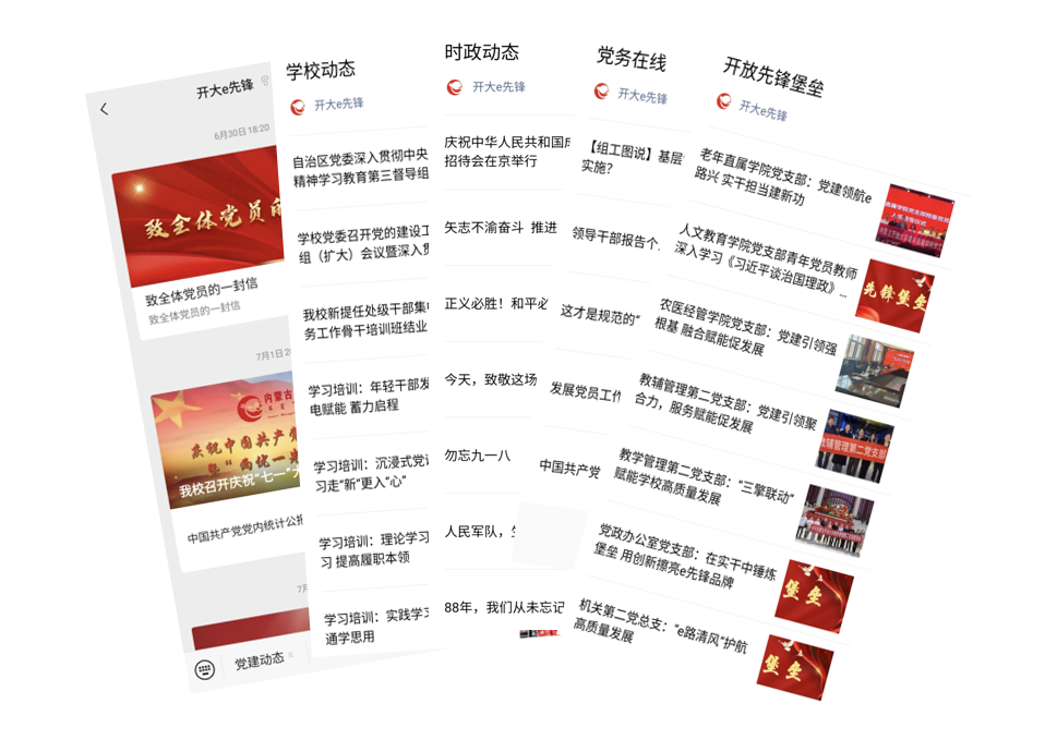 学校启动“开大e先锋”党建品牌创建工作,通过实施“1234”党建品牌创建战略,着力创建主题内涵丰富、亮牌示范过硬、工作措施务实、辐射影响广泛的党建工作品牌。目前学校已创建“开大e先锋”党建子品牌8个,打造党建品牌公众号1个,通过“云上”聚党建合力,“e心”赋办学动能,实现内容常更新、党员全覆盖,有力有效将学校党建工作引向深入。