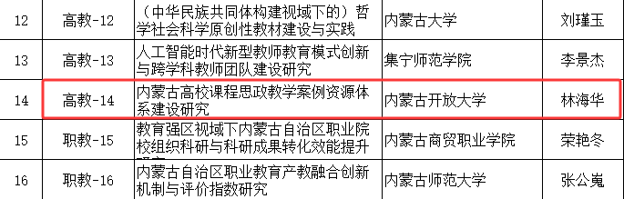 我校林海华副教授申报的《内蒙古高校课程思政教学案例资源体系建设研究》、霍建平教授申报的《内蒙古自治区职业教育资源在社区教育中的共享机制研究》、赵秀荣副教授申报的《内蒙古自治区职业教育中学分银行与转换机制研究》获批重点课题立项。