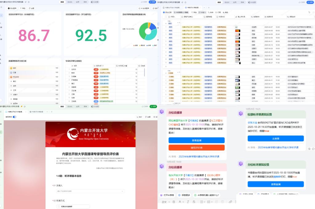 深度契合教育数字化转型趋势,以“一网一平台”为核心载体,整合全区教育教学资源,打造一站式服务生态,实现学生服务、教学管理、质量监控功能深度融合。通过对教学全流程中的关键质量因子进行实时、动态的监测与分析,精准捕捉各教学环节的运行状况以及学生的学习行为与效果,及时发现潜在问题与风险点,为教学决策提供科学依据,有力支撑教学质量提升。认真落实国开总部要求,将直播课督导纳入常规工作,发挥教学督导在稳定教学秩序、规范教学活动、深化教学改革等方面的积极作用。创新听评课督导模式,依托钉钉多维表打造数智化听评课系统,实现管理数字化、智能化、精准化,成为教学质量监控领域的特色化、突破性工作。