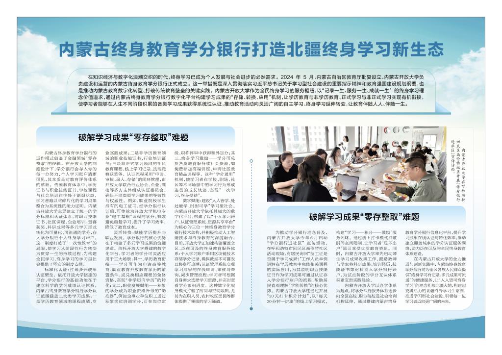 构建“线上+线下”宣传矩阵,开通学分银行官方微信公众号,搭建高效信息交互平台;深入开展“学分银行进社区”专项活动,先后走进社区、老年大学,面对面为居民普及学分银行功能与价值;在内蒙古日报数字报刊登专题文章,以通俗语言传递终身学习理念,覆盖更广泛潜在学习人群。同时启动内部“30 天打卡积分计划”,深化教职工对学分银行运营模式的认知,凝聚工作合力。