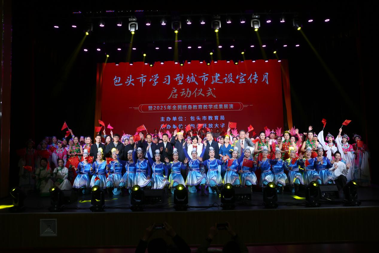 10月16日下午,由包头市教育局主办、包头开放大学承办的学习型城市建设宣传月启动仪式暨2025年全民终身教育教学成果展演隆重举行。内蒙古开放大学,包头市政府相关部门领导,各旗县区教育局及我市参与全民终身教育职业院校、包头市老年大学、旗县区开放大学(学习中心)代表出席活动,与350余名来自社区教育、老年教育、家庭教育领域的师生共同分享包头市学习型城市建设与全民终身教育的丰硕成果。